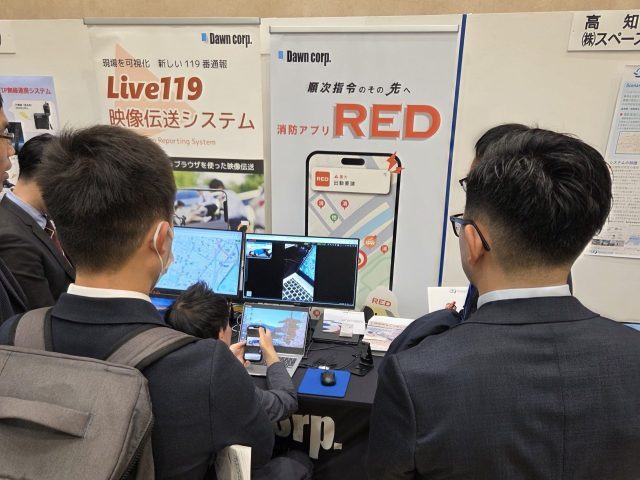 出展ブースでは「Live119」映像通報体験コーナー等を出展いたしました。ブースには多くの参加者がご来場いただき、「Live119」を体験された参加者からは、真剣な表情でシステムに触れながらご質問やご意見をいただくとともに、日頃の運用や将来の活用イメージを語ってくださる姿に大きな共感と励ましをいただきました。