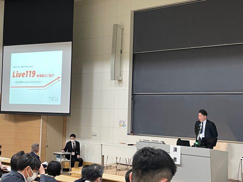 当社は当シンポジウム内プログラムで登壇し、映像通報システムLive119の新機能である「AED位置情報送信機能(特許取得済)*」を中心にご紹介しました。